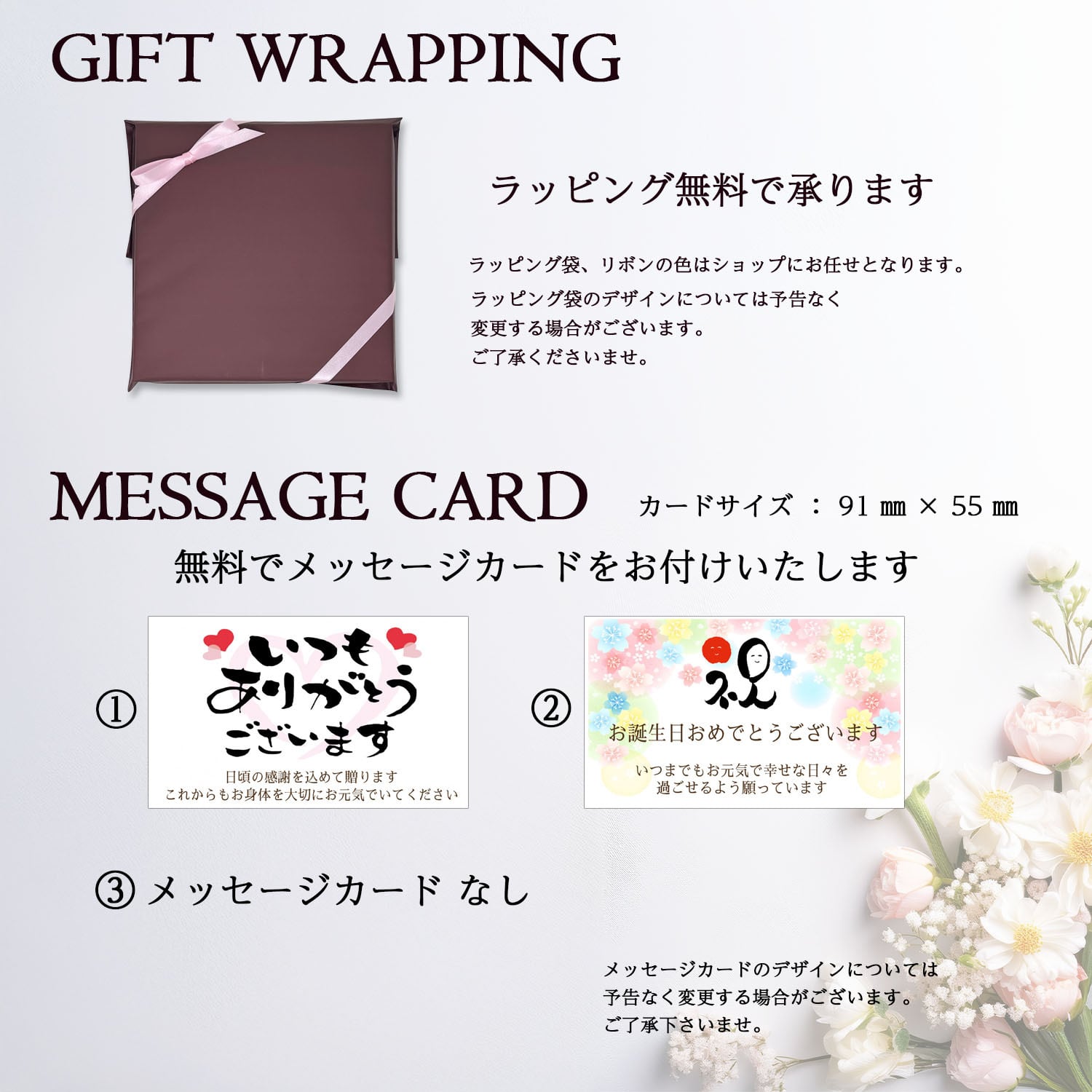 (①ハート「いつもありがとうございます」・②花「お誕生日おめでとうございます」・③メッセージカードなし)