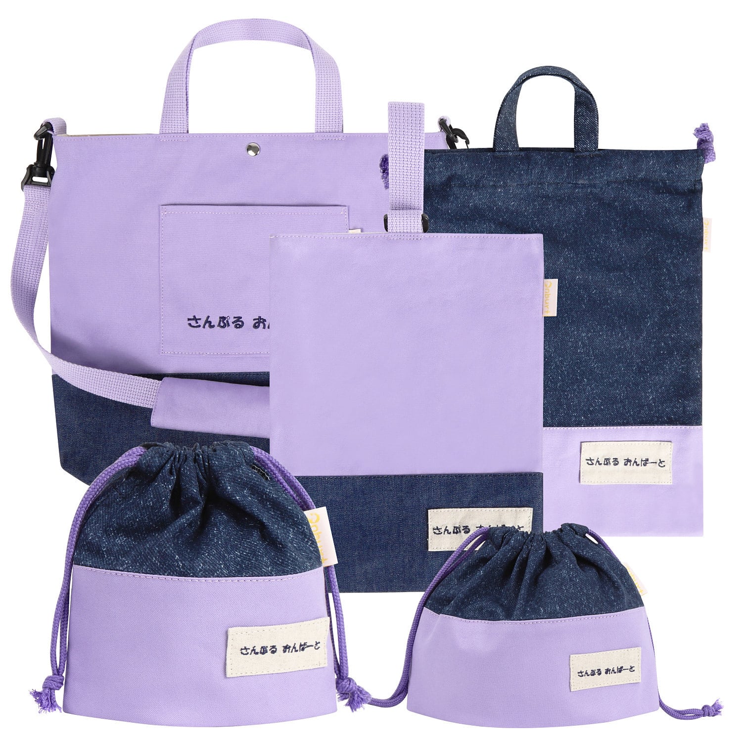 オリジナル 入学 入園 5点セット 世界に一つだけ 刺繍 名入れ ( レッスンバッグ ショルダー付 上履き袋 体操着袋 お弁当袋 コップ袋 ) デニム × ラベンダー