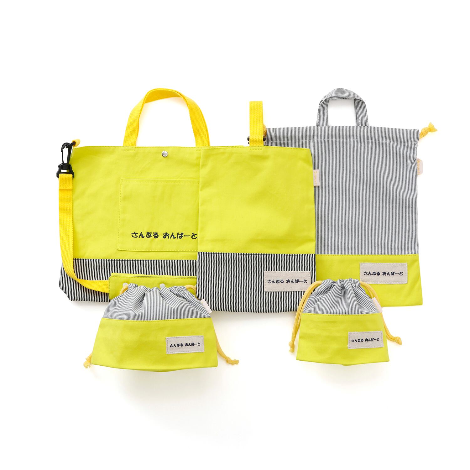 オリジナル 入学 入園 5点セット 世界に一つだけ 刺繍 名入れ ( レッスンバッグ ショルダー付 上履き袋 体操着袋 お弁当袋 コップ袋 ) ヒッコリー × ライムイエロー