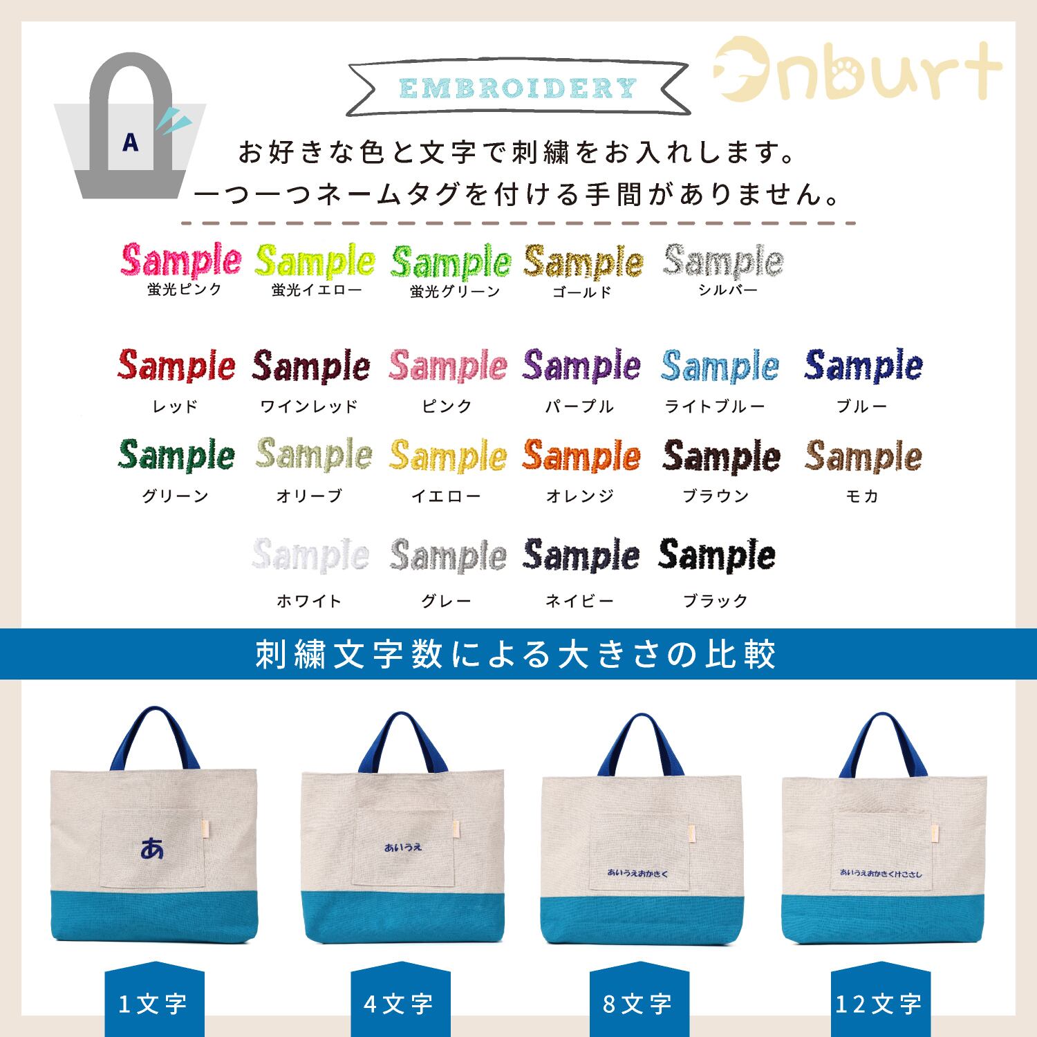 【名入れ】 お好きな文字(お名前)を12文字まで刺繍いたします。